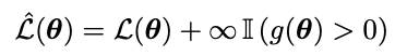 위에서는 equality constraint h(θ)를 활용해 라그랑지 승수를 이해했다. 이번에는 inequality constraint g(θ)에 대해 전개해보자. inequality constraint는 0보다 작거나 같음을 전제했기 때문에 g(θ) <= 0 을 만족해야 한다. 이번 최적화 함수는 unconstrained problem으로 접근할 수 있다. g(θ) > 0 인 경우 값을 무한대로 보내버리는 것이다.