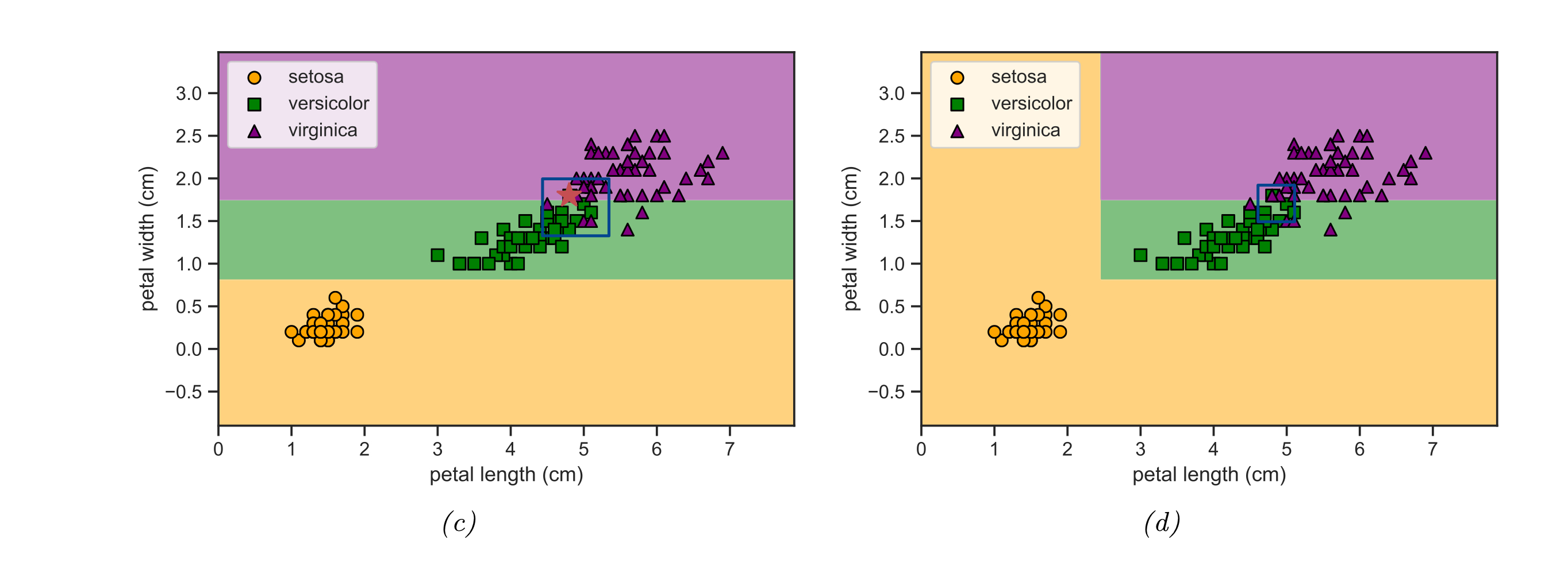 여기서 불안정하단 단점에 대해 조금 더 생각해 보자. 아래 그림의 c의 빨간 별표로 표기된 데이터는 원래 초록색 네모 데이터다. 이는 그림 d에는 존재하나 그림 c에는 없다. 그 결과 그림 c와 d의 클래스별 영역이 눈에 띄게 바뀐 것을 확인할 수 있다.