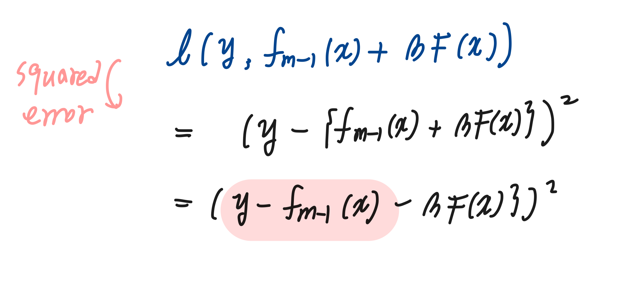 여기서 끝나긴 조금 아쉽다. loss 함수가 squared error loss라고 가정했을 때 부스팅 모델이 어떤 의미를 가지는지 알아보자. 아래 식에서 분홍색 하이라이트된 부분이 잔차(residual)을 나타낸다. true label y와 predicted f간의 차인 것이다.