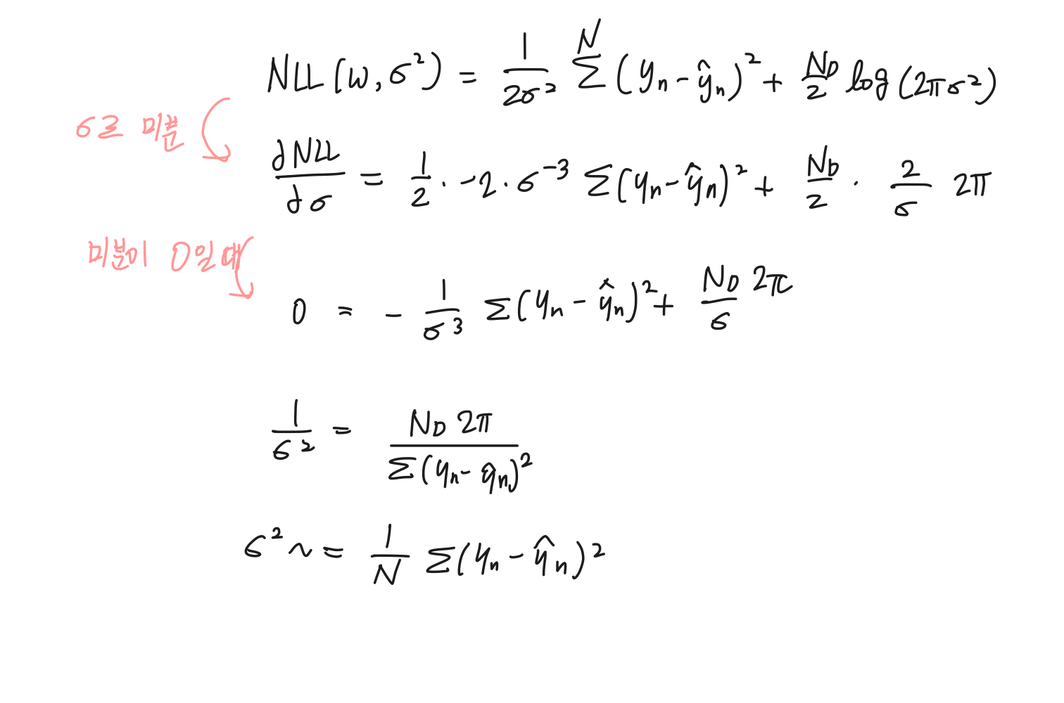 linear regression을 학습함에 있어 업데이트 해야하는 파라미터는 w0, w, σ가 있었다. w0와 w는 구했으니 이제 σ를 구할 차례다. LSS를 σ에 대해 미분한 값이 0인 지점을 찾아보자.
