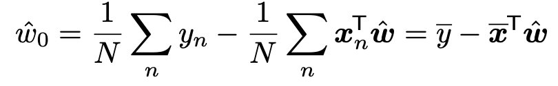 OLS를 통해 w를 구할 수 있었으니 이제 w를 활용해서 bias term인 w0도 구해보자. w0은 baseline으로 x가 0일때 default가 될 값이었기 때문에, y의 평균과 wx의 평균의 차로 나타낼 수 있다.