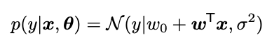 linear regrssion의 기본적인 모델은 아래와 같다. 파라미터 θ에는 bias term인 w0, 가중치(weights) w, y의 분산인 σ이 해당한다. input이 0일 경우에 w0은 baseline과 같은 역할을 하게 된다. (wx + w0 = w0)