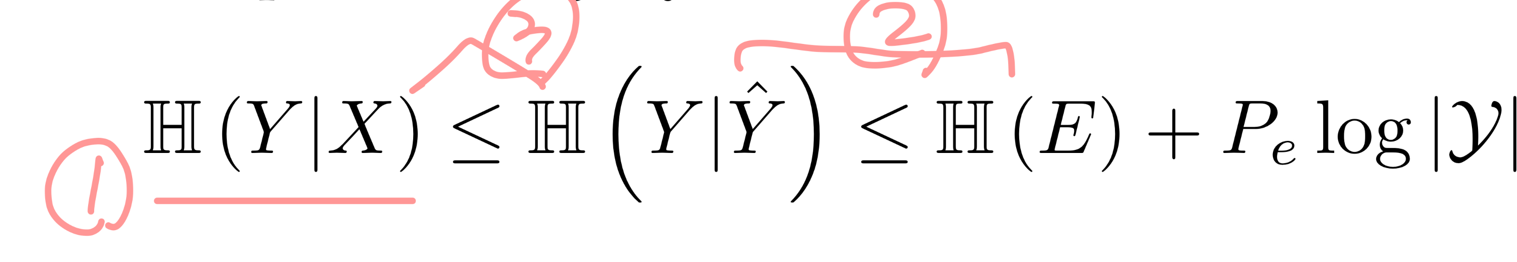 3 - 마지막으로 data processing inequality로 인해 I(Y;Y^) <= I(Y;X)이다.(Y -> X -> Y^인 셈.) H(Y|X) < H(Y|Y^)도 성립한다.