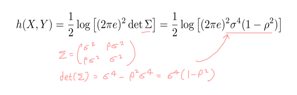 이 식의 σ 자리에는 joint distribution의 분산이 자리하면 되기 때문에, det(∑)가 자리하게 된다. det(A) = ad- bc였음을 기억하면 X,Y의 joint entropy h(X,Y)는 아래와 같이 정리된다.