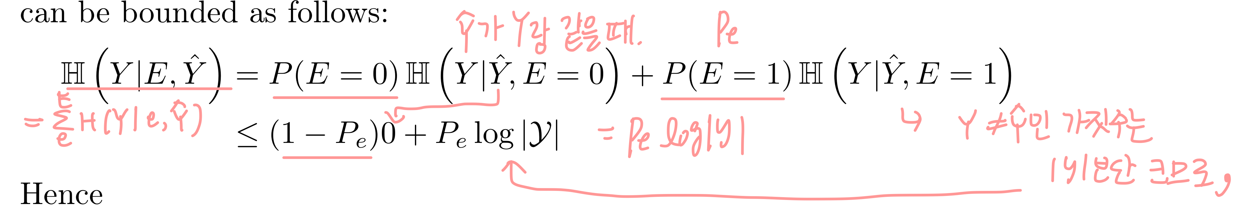 두 개를 더하면 H(Y|Y^) = H(E|Y^) + H(Y|E,Y^)를 도출할 수 있다. 여기서 H(Y|E,Y^)는 아래와 같이 상한선이 생긴다.