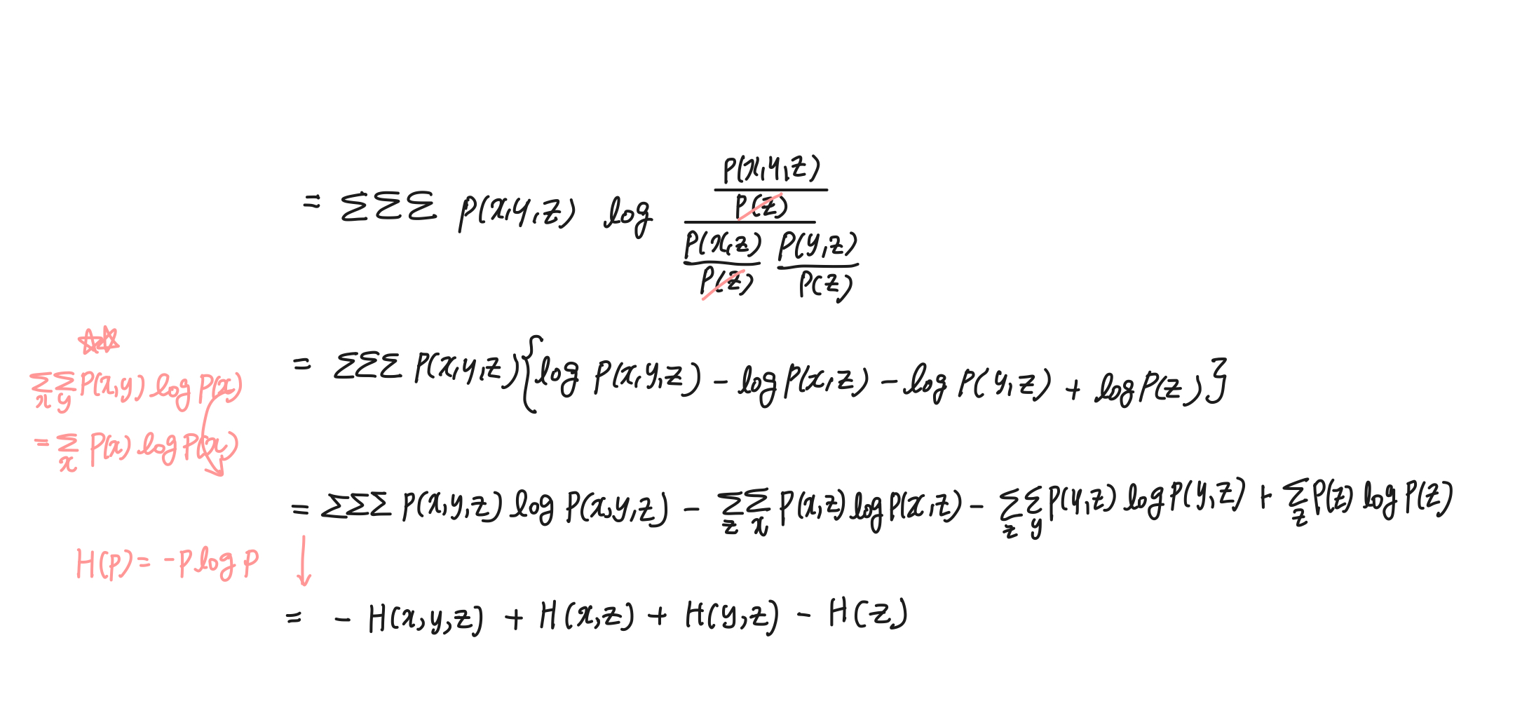 따라서 I(X;Y|Z) = I(Y;X,Z) - I(Y;Z) 임을 보였다. 만약 위 식에서 H(y)가 아닌 H(x)를 더하고 뺐다면 식은 이렇게도 정리가 가능하다.