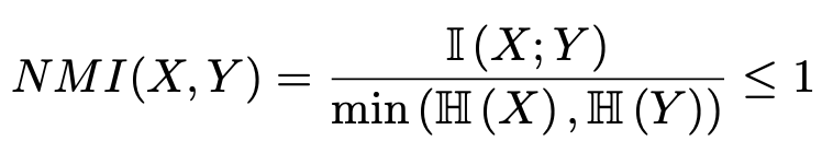 만약 NMI(X;Y)가 1이고 min(H(X), H(Y)) = H(X)라면, H(X|Y) = 0을 의미한다. conditional entropy H(X|Y)가 0이란 뜻은 H(Y)가 H(X)에 무조건 속하는 상태로도 해석할 수 있다. 따라서 NMI값이 1이란 뜻은 두 변수 중 하나가 무조건 상대 엔트로피의 포함관계인 것이다.