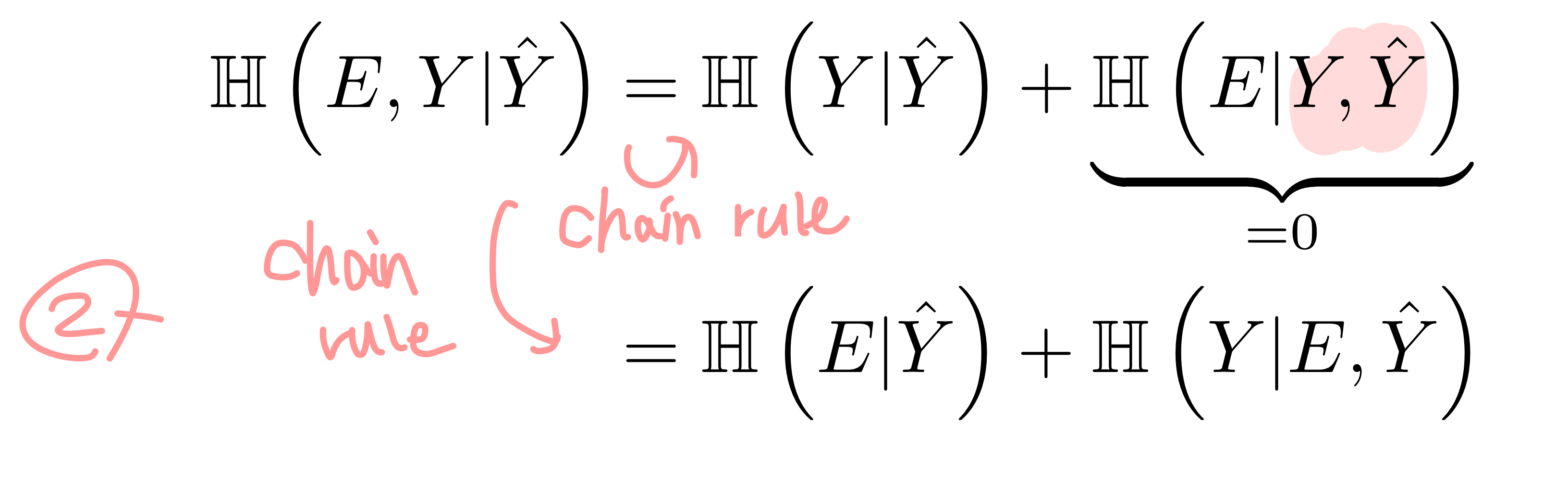 2 - 두 번째로는 H(Y|Y^) <= H(E) + Pe log|Y|임을 증명해 보자. 여기서는 H(Y2,Y1|Y0) = H(Y1|Y0) + H(Y2|Y1,Y0)인 chain rule을 사용한다.