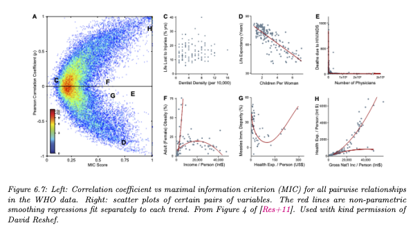 MI의 특징 상 MIC가 0이라면 x, y간 어떤 관계도 없음을(independent), 1이라면 noise-free한 관계를 가짐을 알 수 있다. 변수간 상관성을 보는 방법으로는 상관계수(Correlation Coefficient. corr)도 있다. MIC는 상관계수와 다르게 linear한 관계만을 보지도 않는다. 그렇기 때문에 corr을 구하는 대신 MIC를 보는 것이 유용할 때도 있다. 예를 들어 아래의 그림에서 E,F,G는 각각 2개의 변수에 대한 계수를 구한 지점이다. 각각 상관계수가 0에 가깝지만 MIC를 봤을 땐 0.5보다 크므로, 선형적인 상관성은 없을지 몰라도(corr = 0) 실제로는 상관성이 있다.