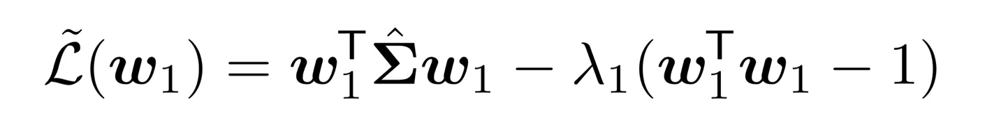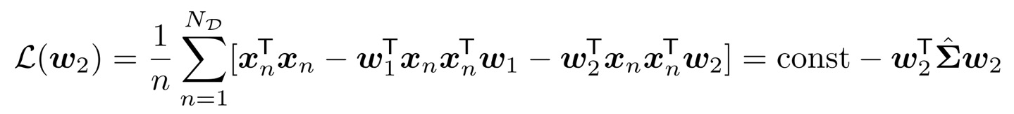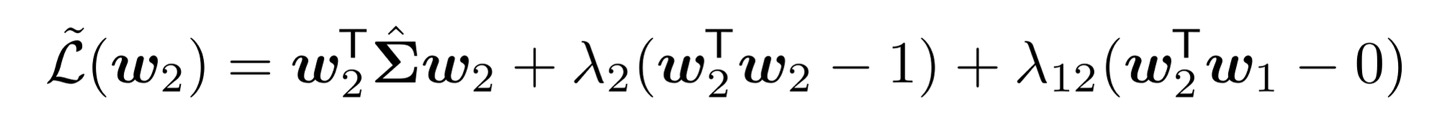 동일하게 w의 크기를 1로 제한해서 loss를 변형해주자. 추가로 orthogonal한 특성인 w2 w1 = 0도 loss에 반영될 수 있도록 lagrange multiplier를 하나 더 추가해 주었다.