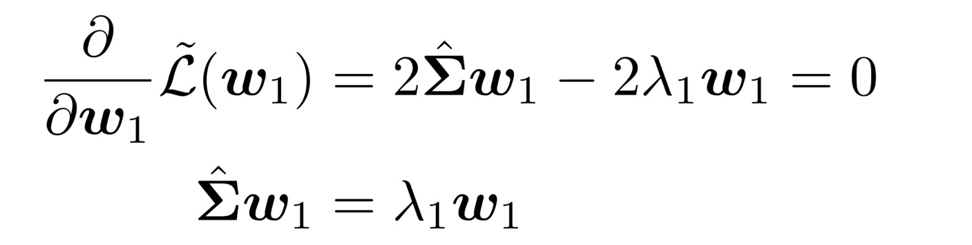 재미있게도 w1은 ∑의 eigenvector 형태로 식이 정리되었다! (EVD에서 eigenvector를 설명할 때 어떤 행렬 A에 대해 AU = λU로 표현할 수 있으며, 이때의 U는 eigenvector, λ는 eigenvalue였다. 자세한 설명은 이전 글 중 https://hi-lu.tistory.com/entry/Eigenvalue-Decomposition-EVD%EC%9D%98-%EC%88%98%EC%8B%9D-%EA%B8%B0%EC%B4%88 참고.)