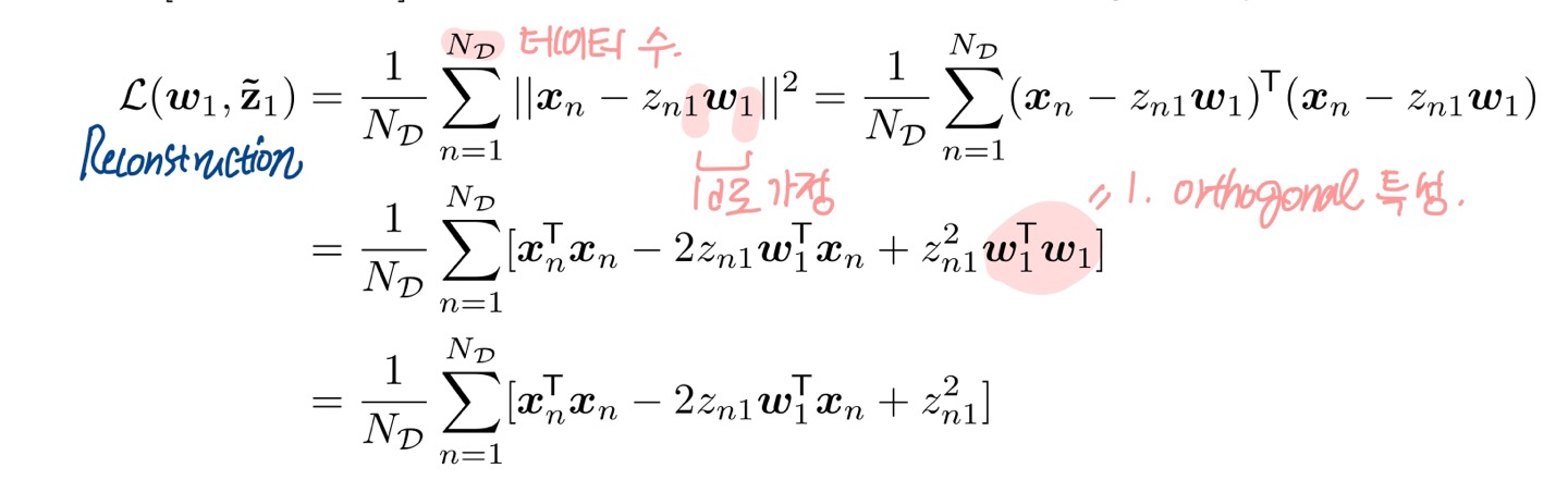x의 주성분이 하나일 때를 생각해보자. 이때는 N개의 데이터가 있을 때 reconstruction error를 다음과 같이 전개할 수 있다. PCA는 'w는 orthogonal한다'다는 가정을 전제하에 진행이 된다. orthogonal함은 W 내의 row들이 서로 직교한다는 뜻이며, 이는 i, j번째 row에 대해 wi wi = 1, wi wj = 0 을 의미한다. w1 w1 = 1임을 기억하자.