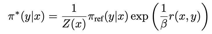 여기서 Z는 아래와 같다. 업데이트 중 모델인 π와는 무관한 partition function이다. πref와 x로 이루어져있지만 π와는 무관하단 점을 기억해야 한다.