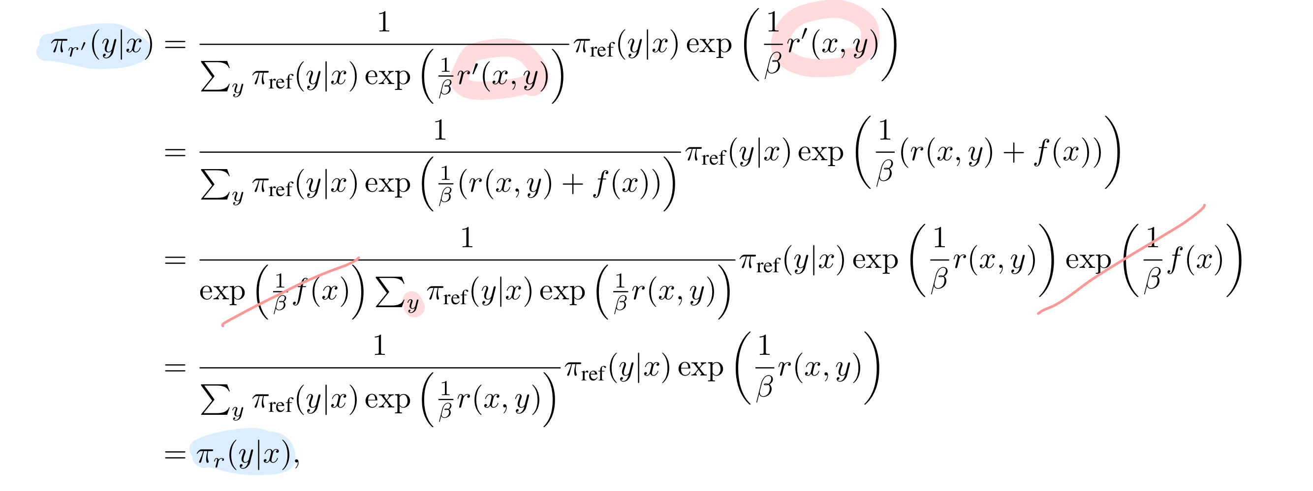 여기서 우리는 위 식을 만족하는 f가 존재하는지만 알면 r(x,y)와 모델의 policy π가 동일하다 말할 수 있다. 그리고 만족하는 f가 당연히 있다. DPO 설명의 중간수식 1 에 해당하는 식을 유심히 들여다보자. 생긴게 너무너무 DPO reward model 증명1 와 닮았다!