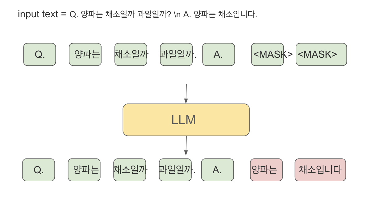 이러한 QA쌍을 학습하려면 어떻게 하면 될까? 위 pretrain 과정에서는 주어진 input 문장에 대해 랜덤 하게 토큰들을 <mask> 시켰다. finetuning에서는 Answer에 해당하는 답변에 전부 mask를 취한다.